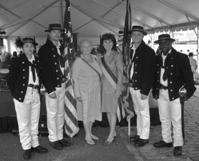 Below—Massachusetts State President Ginny Mucciaccio with President National Ginger Apyar and the Color of the USS Constitution at the USPS First Day of Issue for the USS Constitution Bicentennial Postal Stamp at dockside. 18 Aug 2012
