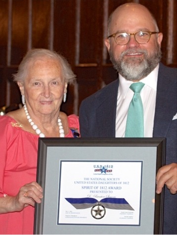 New England Historic Genealogical Society’s President D. Brenton Simons received the prestigious Spirit of 1812 Award from Massachusetts State President Ginny Mucciaccio at the Harvard Club in Boston. The event was attended by the trustees, council and leadership staff of NEHGS plus guests, including Mary M. Tedesco, co-host of the PBS Genealogy Roadshow, who is also an applicant to the Massachusetts State Society USD 1812.